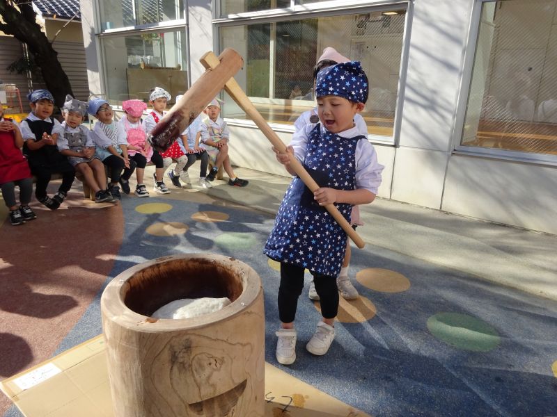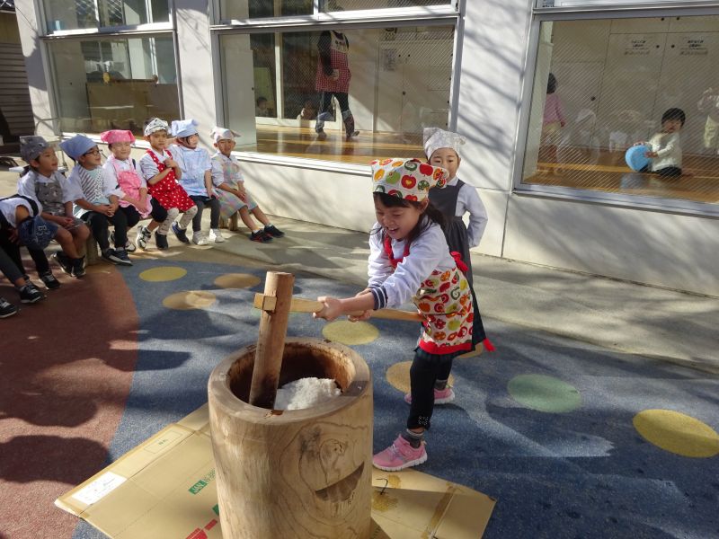 12月は行事がたくさんありました。19日のおもちつきでは、年長組が一人ずつお餅をつき、他のクラスは見学・応援をしました。もち米を一生懸命つく子ども達。「よいしょー!」「がんばれー!」ととても盛り上がりました。 |