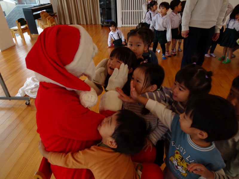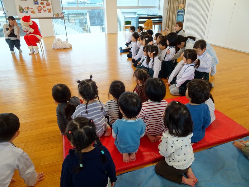 24日はクリスマス会がありました。みんなでクリスマスのパネルシアターを見たり歌をうたっていると保育園にもサンタさんが来てくれました。サンタさんに大興奮の子ども達!サンタさんに質問したあと、各クラスにプレゼントをもらったり写真を撮ってもらい大喜びでした。 |