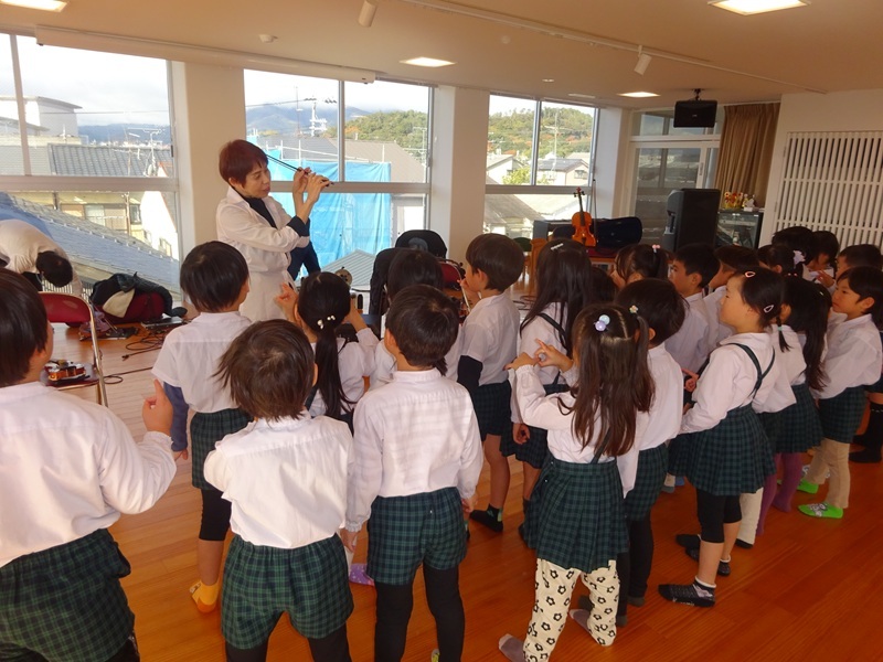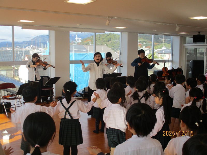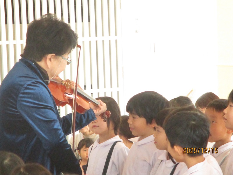 12月15日、「すくすく合奏団」によるバイオリンコンサートがありました。0歳児から5歳児の子ども達が集まりみんなが知っている曲「ミッキーマウスマーチ」や「にじ」を演奏してもらいました。子ども達の耳元まで来てもらい普段聴くことのできない音色に耳を傾けたり、バイオリンの演奏に合わせて踊ったりと楽しいひとときを過ごしました。 |